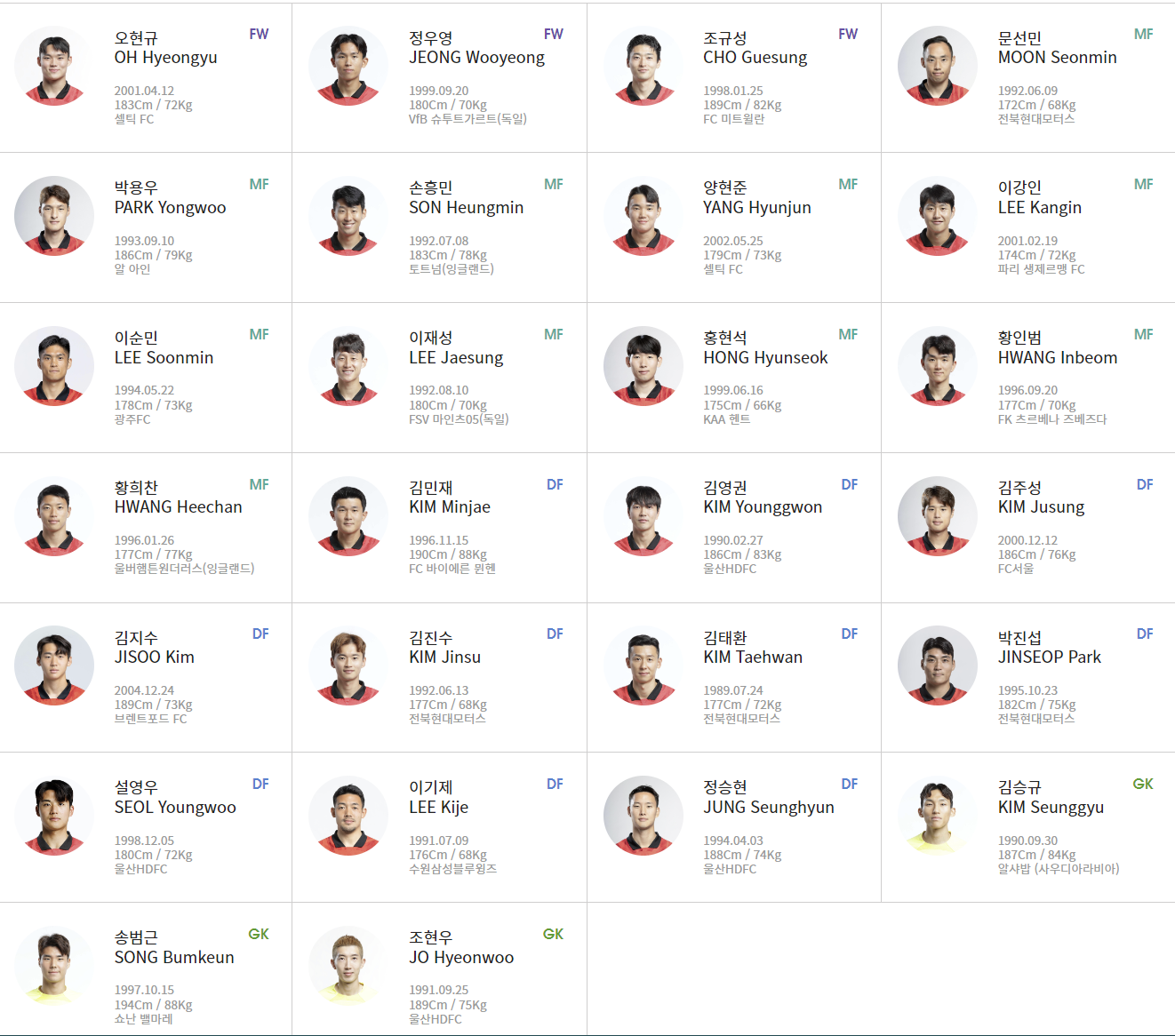 자랑스러운 대한민국 축구 국가대표 선수 명단