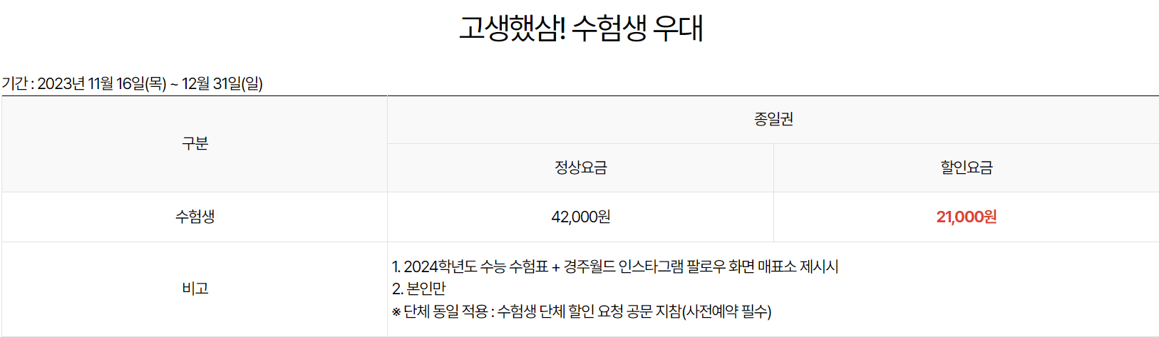 - 현장매표소 매표시 근무자에게 2024학년도 수능 수험표 + 경주월드 인스타그램 팔로우 화면 매표소 제시.